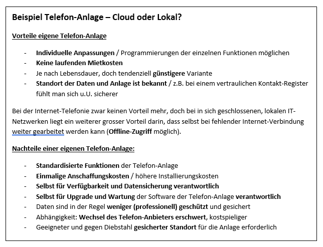 Bei der Anschaffung einer Software, einer IT-Infrastruktur (Server) oder einer Telefon-Anlage empfehlen wir eine sorgfältige Abwägung der Vor- und Nachteile – immer auch unter Berücksichtigung des strategischen Gesamtkontext.